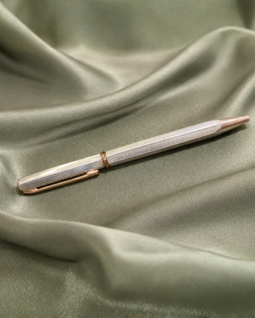 Handcrafted Sterling Silver Guilloché Ballpoint Pen with Rose Gold Accents