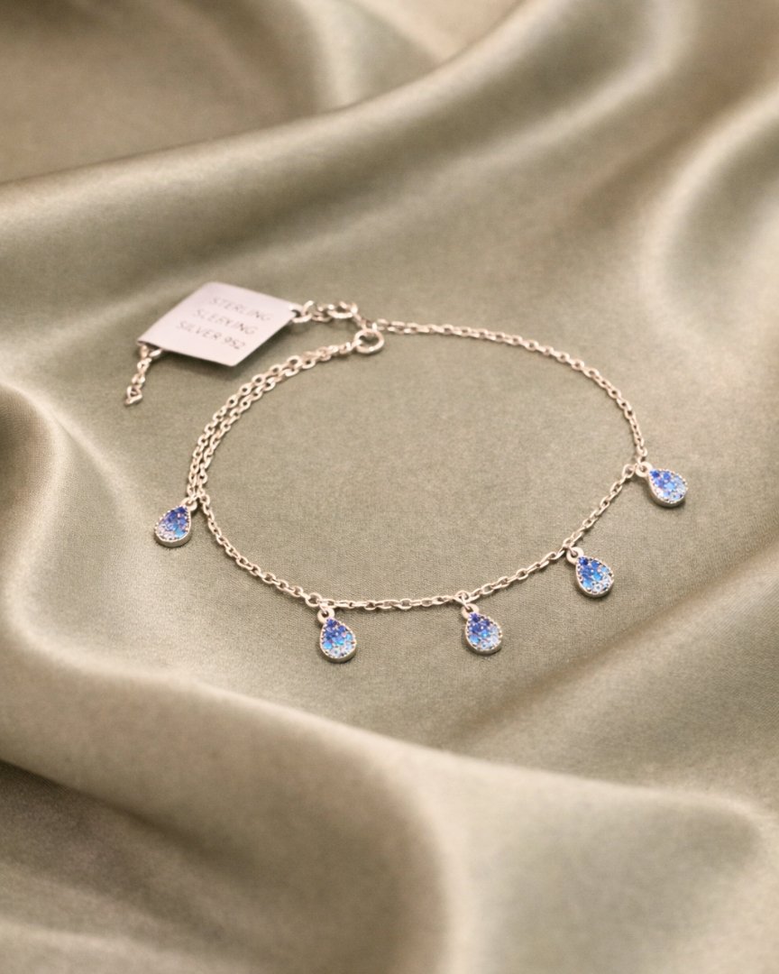 Delicate, graceful, and effortlessly chic, this sterling silver anklet features a fine chain adorned with blue droplet-shaped...