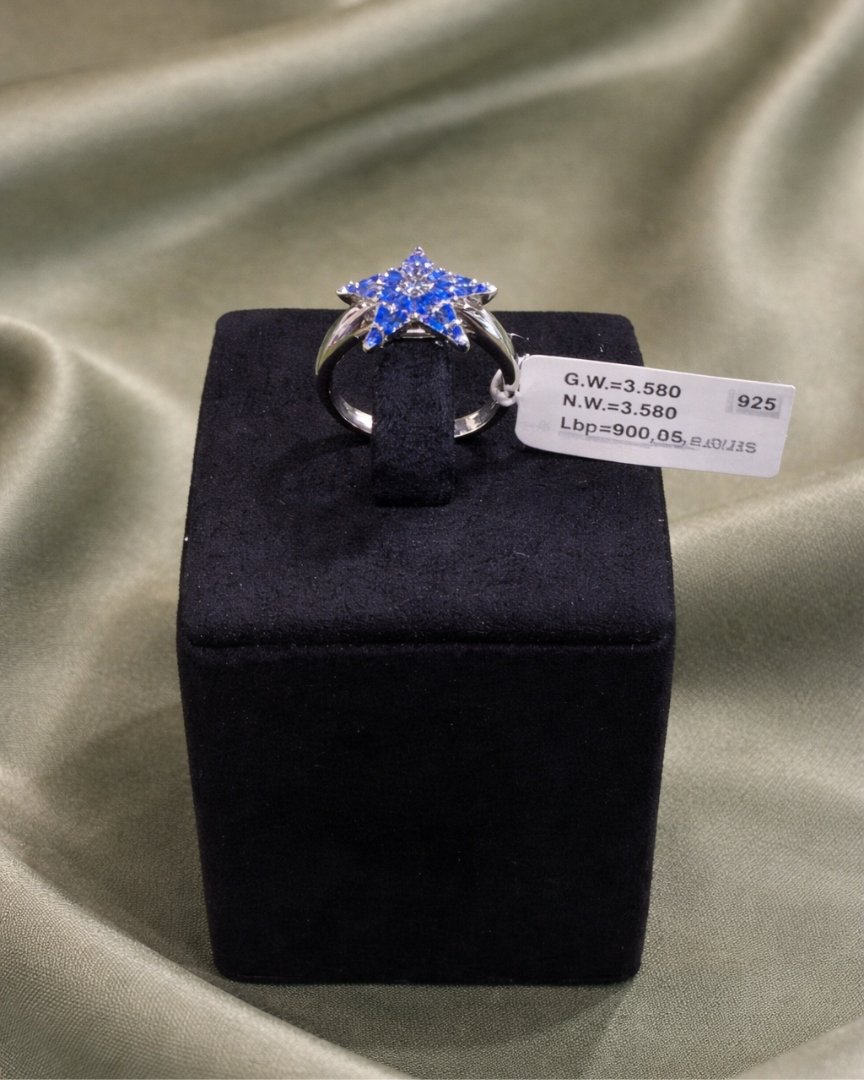 Bold yet elegant, this sterling silver ring features a striking star-shaped top adorned with a vibrant blue...